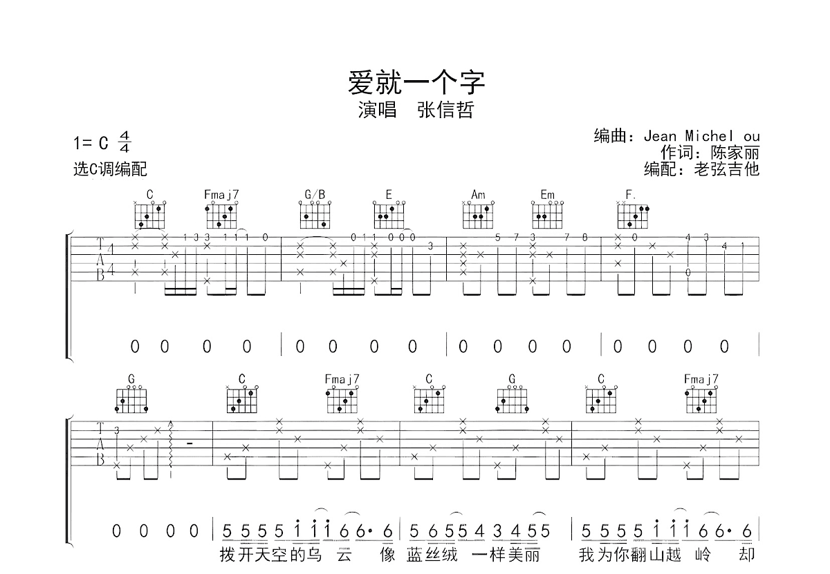 张信哲《爱就一个字》吉他谱(动画片《宝莲灯》主题曲)