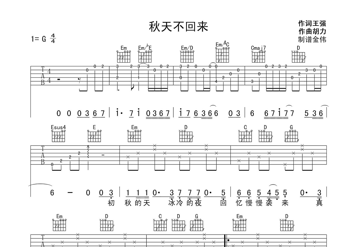 《秋天不回来》原唱王强吉他谱细心制作保持原版味道 1吉他谱采用G调编配 2原版基础上合理优化指法 3前奏间奏完整 4认真做每一份乐谱,感谢支持,觉得不错可以查看制谱者(风中的翅膀)发布的更多乐谱