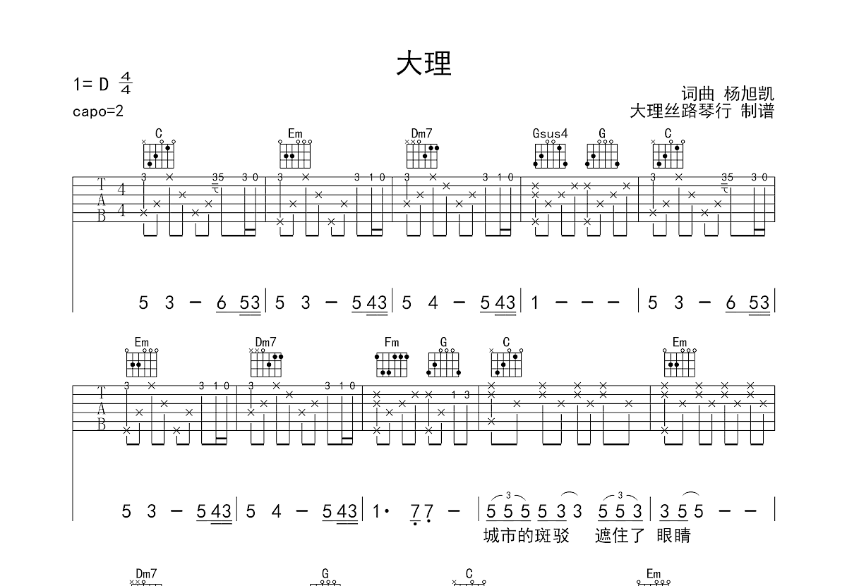 - 曲谱包含和弦指法图;六线谱;简谱;歌词