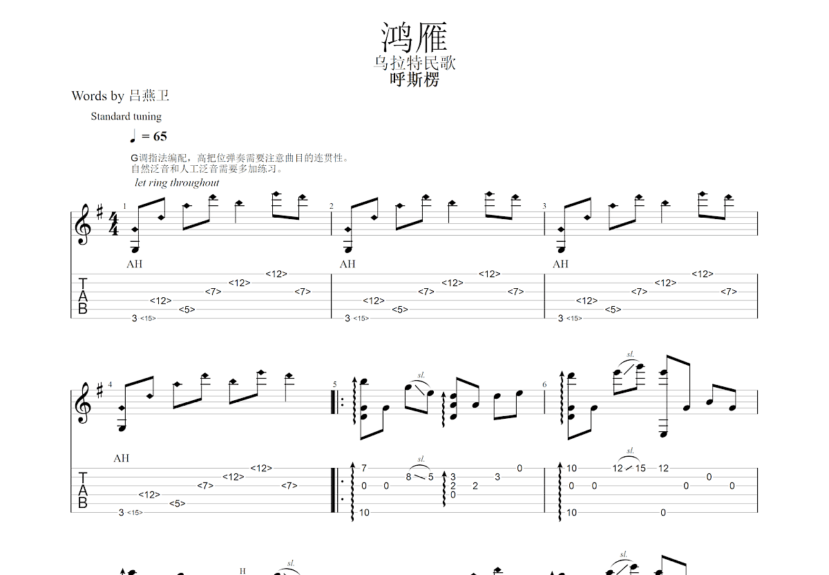 呼斯楞《鸿雁》吉他谱(乌拉特民歌)